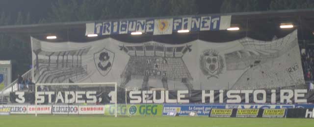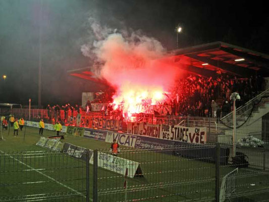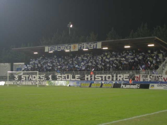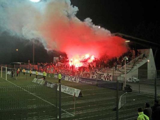 Nach langer Zeit sollte es heute mal wieder auf ne vernünftige Tour gehen. Geplant waren vier Spiele an drei Tagen. Doch der Reihe nach... Nach der Nachtschicht ging’s mit der Familie zum Frankfurter Flughafen, dort wurde mit den Kids etwas Planespotting betrieben und zur Belustigung etwas im McD herumgetollt. Nachdem man sich verabschiedet hatte gings dann Richtung Gate und kurz darauf auch in den Flieger gen Lyon. Vom Flug bekam ich nicht allzu viel mit, da dieser weitestgehend verpennt wurde. Lyon empfing mich mit Sonnenschein und angenehmen 12 °C. Vom Flughafen gings per Shuttle- Bus zum Bahnhof Part Dieu, wo ich feststellen musste, dass man in Frankreich ohne Kreditkarte ganz schön aufgeschmissen ist. So musste ich mich also in einer schier endlosen Reihe am Kundenschalter anstellen, um das Zugticket nach Grenoble zu lösen. Um kurz vor 17 Uhr gings dann weiter, und es sollte nicht lange dauern, bis ich wieder am pennen war. In Grenoble gönnte ich mir dann erstmal nen heißen Kaffee und machte mich dann auf den Weg zum Stadion, welches nach einer guten halben Stunde problemlos gefunden wurde. Vor dem Stadion traf ich auf Maik, mit dem die Tour dann gemeinsam weiter fortgesetzt werden sollte. Im "Stade Lesdiguieres" sollte heute das letzte Ligaspiel stattfinden, da Grenoble Foot in den nächsten Wochen in das neue "Stade des Alpes" umziehen wird. So durfte man also gespannt sein, was sich die Fans zur Stadionverabschiedung haben einfallen lassen. Für 8 Euro erhielt ich Einlass und durfte dann eine recht gute Choreo der Gastgeber betrachten. Vom Tribünendach wurde ein ca. 30 x 5 Meter großes Tuch heruntergelassen auf dem drei Stadion zu sehen waren. Eine Zaunfahne mit der Aufschrift „ 3 Stades - 1 Seule Histoire“ rundete das Bild dann ab. Während des gesamten Spiels hing am Tribünendach noch ein Banner in Vereinsfarben „Tribune Finet“. Nachdem das Tuch entfernt wurde, wedelten die Fans mit blau- weißen Fähnchen, was auch recht nett anzusehen war. Die Anfangsphase des Spiels hingegen hatten man sich und vor allem auch die Grenoble Fans dann wohl anders vorgestellt. Die Gäste aus Amiens spielten locker auf und führten bereits nach zwanzig Minuten mit 0:2. Dann fand der Gastgeber aber besser in Spiel und konnte auf 1:2 verkürzen, was den Stimmungspegel im Stadion rasant anstiegen ließ. Tribüne und Kurve peitschten ihr Team voran, welches kurz vor dem Halbzeitpfiff dann den gerechten Ausgleichstreffer erzielen konnte. Die zweiten fünfundvierzig Minuten hätten sich dann beide Teams locker sparen können, da auf dem Rasen nichts mehr erwähnenswertes passierte. Die Hoffnung auf eine eventuelle Bengaloshow erfüllte sich dann nach dem Schlusspfiff, als die Gastgeber ordentlich zu zündeln begannen. Mit gut 30 Bengalen wurde die Hintertortribüne und später dann auch das gesamte Stadion eingenebelt. Somit ein ordentlicher Rahmen für die Verabschiedung eines Stadions! Nach dem Verlassen des Stadions traf ich mich mit Maik wieder, um die weitere Vorgehensweise der Nacht zu besprechen. Maik war von Osnabrück per Mietwagen angereist, und in diesem sollte auch eigentlich die erste Nacht verbracht werden. Doch bei den außen herrschenden Temperaturen und dem Faktor das wir beide doch ziemlich kaputt waren, wurde beschlossen das wir noch ein Stück weiter fahren und unterwegs noch nach was billigen zum nächtigen Ausschau halten wollten. Leichter gesagt als getan, denn irgendwie meldete jedes Hotel an dem wir es versuchten „ausgebucht“. Ein paar Hotels später erhielten wir dann die Erklärung das an diesem Wochenende hier in der Gegend irgend ne populäre Autorally stattfand deswegen sei es hier unmöglich was freies zu finden. Prima! Die Orte Romans und Valence hatten wir dann schon hinter uns gelassen und meiner einer sich schon mit dem Gedanken „Autositz nach hinten und gute Nacht“ abgefunden, wurden wir in Montélimar dann doch noch fündig. Dank Maiks Kreditkarte konnte problemlos eingecheckt werden und wenig später fielen dann auch schon die Augen im gut beheizten Hotelzimmer zu.