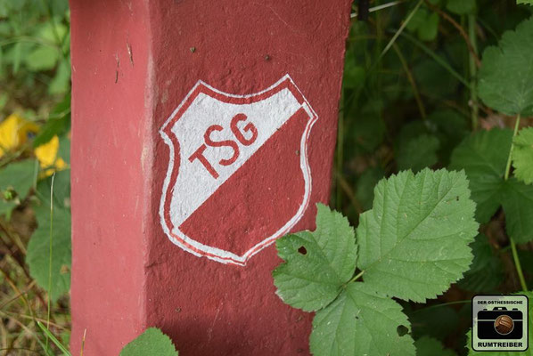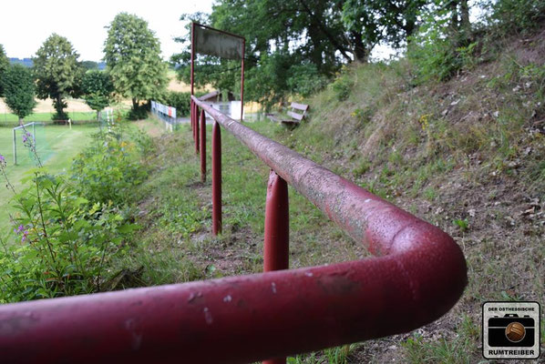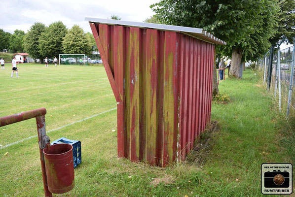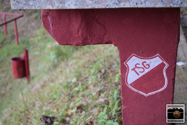 kleinen Tribüne mit drei Sitzreihen über mehrere kleine charmante Hingucker. Die um das Spielfeld herum gebauten Barrieren, sowie die beiden Reservebänke sind in den Vereinsfarben der TSG