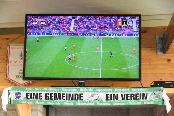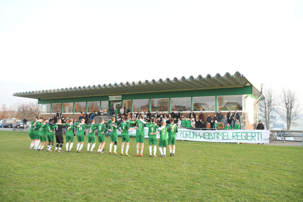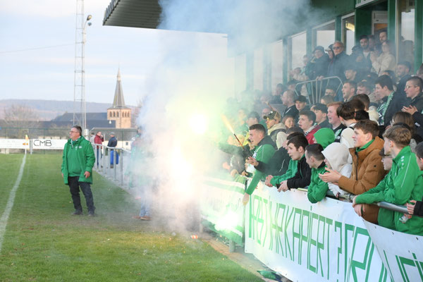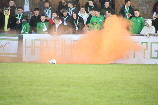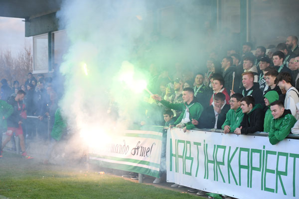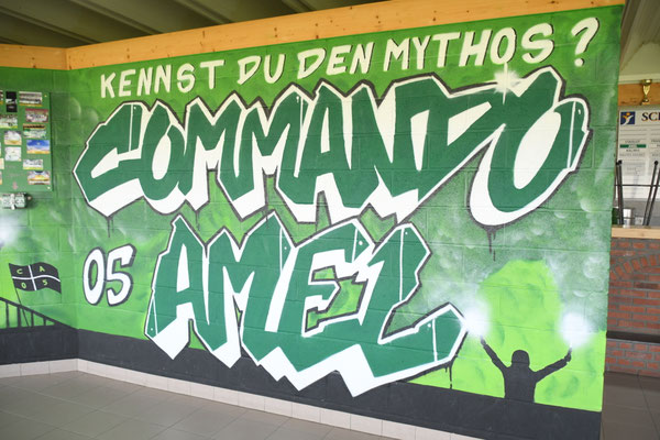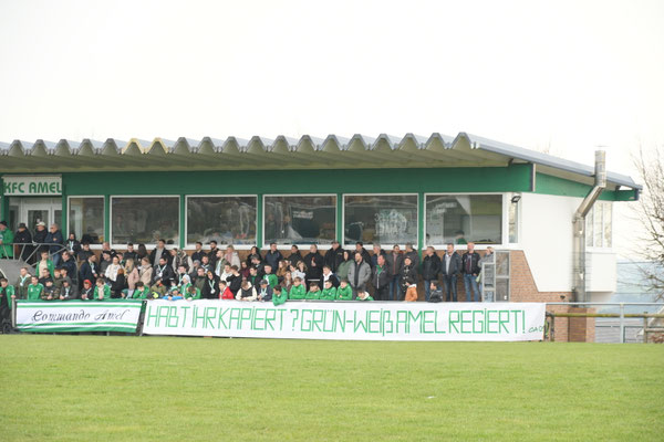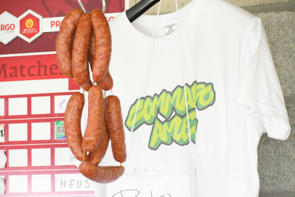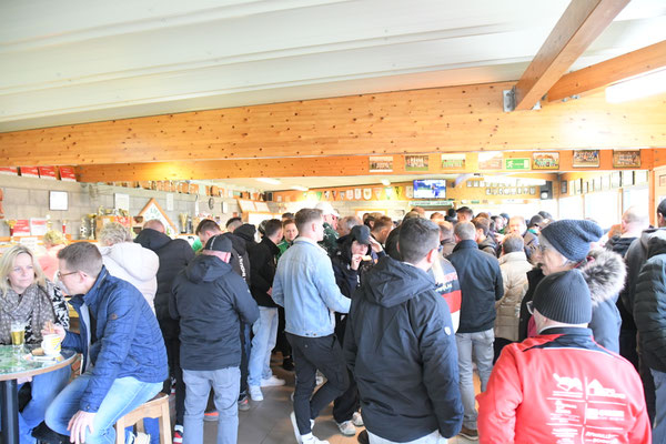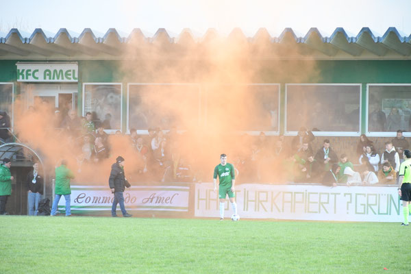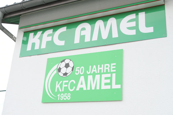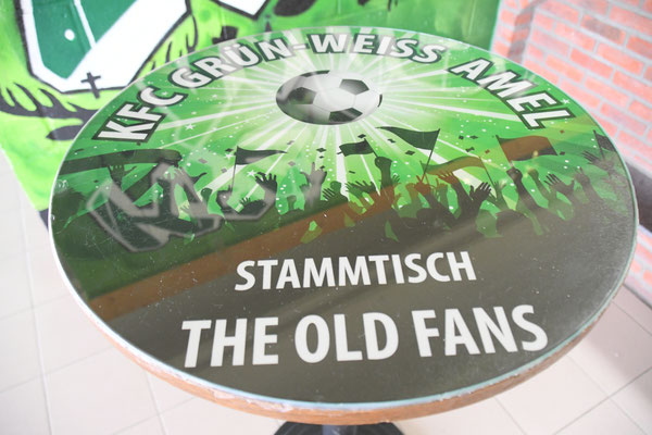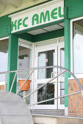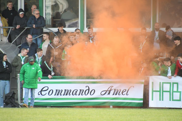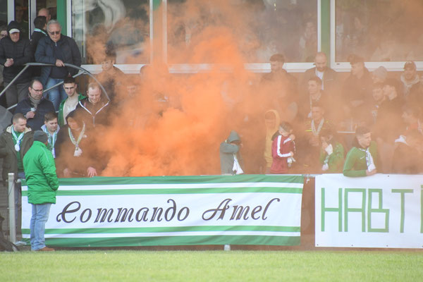 48 Stunden nach dem fulminanten Auftritt des „Commando Amel“ in Malmedy, galt es heute dem grün-weißen KFC Amel einen Besuch abzustatten. Seit Monaten geplant – das heutige Derby gegen Olympia Recht. Beide Stadien trennen lediglich elf Kilometer, demnach sollte für Stimmung unter der kleinen aber feinen Tribüne gesorgt sein. Eintritt für lau, dank freundlichem Kontakt mit dem gastgebenden Verein. Über die gesamte Tribüne ziehen sich drei Stufen, ansonsten nix groß zu sehen im weiteren Umfeld. Erwähnenswert ist allerdings das absolut geniale Vereinsheim mit Graffiti und viel Liebe zum Detail, massenhaft Bilder, Wimpel und Wurstwaren. Selten so was geiles gesehen in Belgien! Mit Anpfiff entwickelte sich nen ansprechendes Spiel und der heimische KFC ging zur Freude der zahlreichen Zuschauer in der 20. Spielminute in Führung. Aus Recht waren wohl auch ein paar da – aber sehr unauffällig! Zu diesem Zeitpunkt wusste man noch nicht, dass das 1:0 bereits das Tor des Tages war, demnach war auf Seiten des KFC Amel bangen und zittern bis zum Schlusspfiff angesagt. Zu Beginn der zweiten Halbzeit gabs ein paar Rauchtöpfe zu bestaunen und die anschließende Siegesfeier mit der Mannschaft wurde mit grünen Bengalos zelebriert. Top Sache, top Abend! Ich verabschiedete mich und machte mich auf den Weg zur mir empfohlenen besten Friture Ostbelgiens. Diese will natürlich auch beim Namen genannt werden: Fritüre Peters – und ich wurde nicht enttäuscht! Freundliche Bedienungen und nettes gemütliches Ambiente. Frikandel und Fritten mal mit Messer und Gabel zu essen, is auch mal was neues! Mit der Abenddämmerung ging es dann zurück auf die Straße und heimwärts.