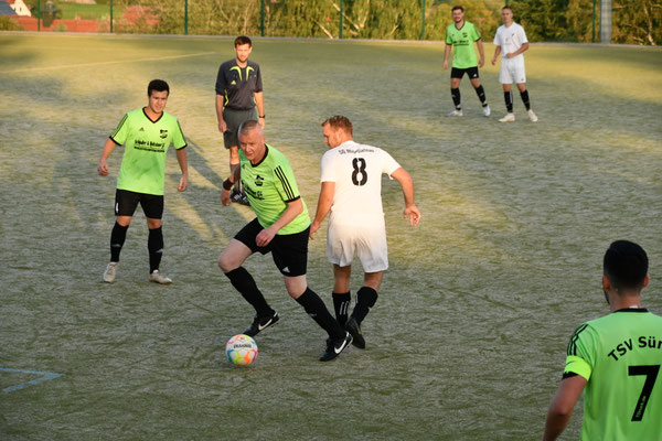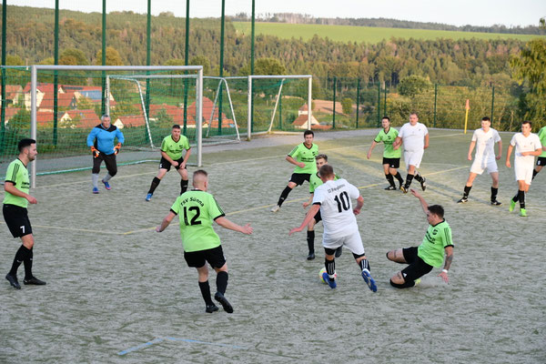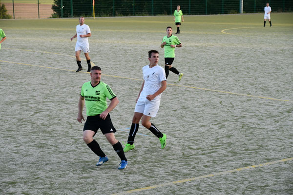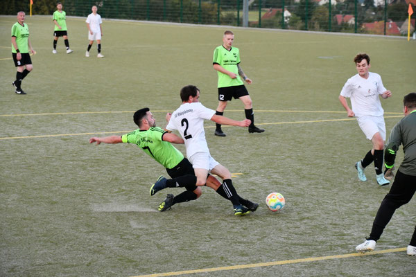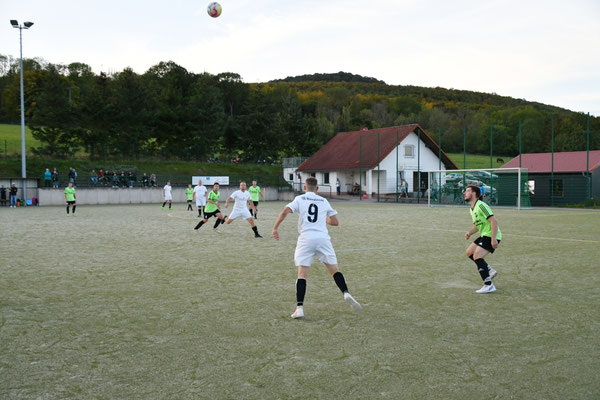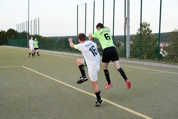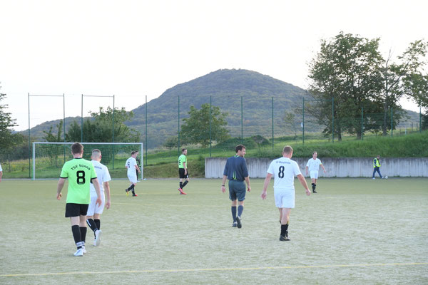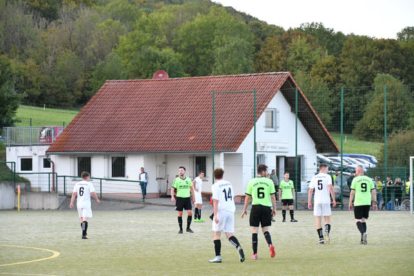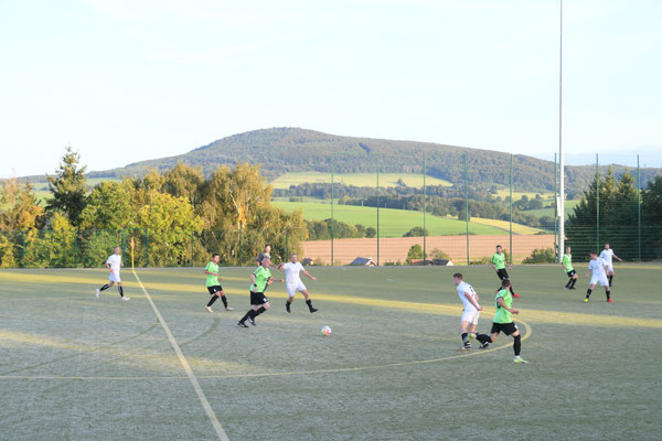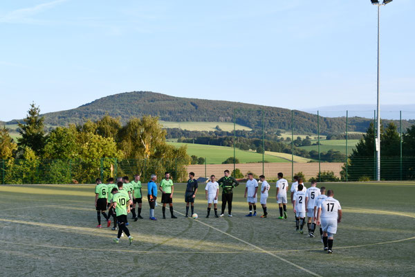 Ich liebe das Geräusch von Dehnungsfugen, wenn man über die Autobahn brettert... Im sportlichen Fahrstil gings vom Sportplatz in Gotha nach Wölferbütt, einem Ortsteil der Stadt Vacha, nahe der hessischen Landesgrenze. Wölferbütt wurde das erste Mal urkundlich im August 786 in einer Schenkungsurkunde von Karl dem Großen an das Kloster Hersfeld erwähnt und hat heute rund vierhundert Einwohner. Ein kleiner Teil dieser begab sich heute Abend auf den Sportplatz, welcher sich oberhalb der Ortschaft befindet. Mit dem Einlaufen der Mannschaften auf dem Plaste-Rasen betrat ich das Sportgelände, welches bautechnisch überzeugen kann. Auf der Hauptgeraden befinden sich auf einer leichten Anhöhe mehrere Sitzbänke, darunter sind vor einer Betonwand die beiden Reservebänke verbaut. Die in weiß gekleideten Gastgeber des SV "Grün-Weiß" Oechsen 1906 begannen engagiert, doch im Abschluss blieb man leider erfolglos. Besser machten es die Gäste des SV Kali Unterbreizbach, die ihre Chancen konsequent nutzten und zur Halbzeit sicher mit 0:2 führten. Die Unterbrechung nutzte ich dazu, mir warme Klamotten aus dem Auto zu holen und die zweite Thüringer Bratwurst des Tages zu verspeisen. Gott Lob die thüringische Fleischer- und Grillkunst, denn was man hier serviert bekommt ist einfach Weltklasse! In der zweiten Halbzeit verkürzten die heimischen Weißhemden auf 1:2 und es lag wieder etwas Spannung in der Luft. Diese wurde allerdings mit dem 1:3 Siegtreffer für die Unterbreizbacher wieder zu Nichte gemacht. Dennoch konnte ich mit Abpfiff zufrieden abziehen und hatte einen wunderbaren Tag im benachbarten Thüringen.