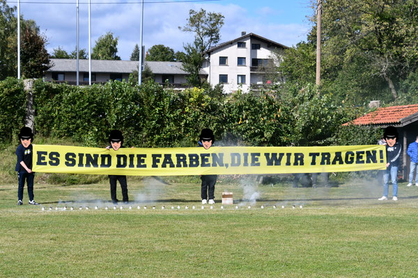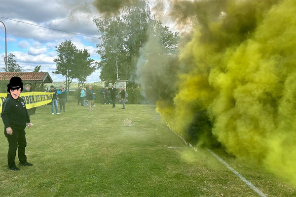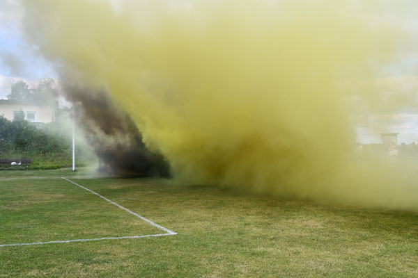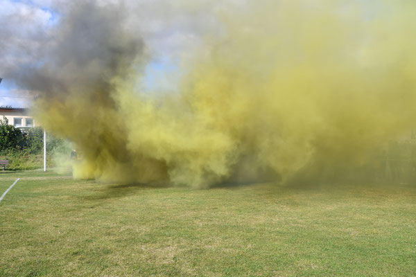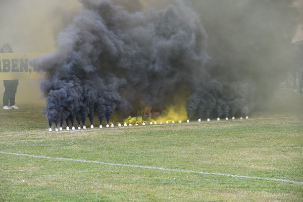vorne. Beim Einlaufen der Kontrahenten auf das „Schlachtfeld“ versuchen sich beide Seiten mit Rauch- und Bengalartikeln zu irritieren. Mansbach zeigt einen sehenswerten Banner mit der