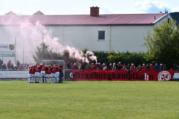 Aufschrift „Grasburgkampfbahn“ und gibt, vornehmlich gekleidet in den eigenen Vereinsfarben ein ansehnlich geschlossenes Bild ab. Da zieht euer Droog und Schreiber schon mal seine Melone und